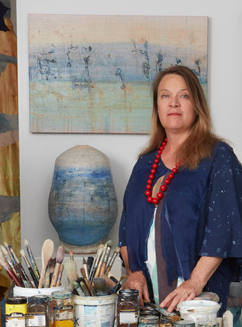 two mediums, a conversation between paint and clay. This concept is further extended with ceramics becoming part of an installation context, including sculptural forms embedded with ceramic shards.